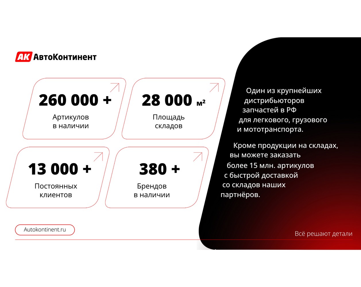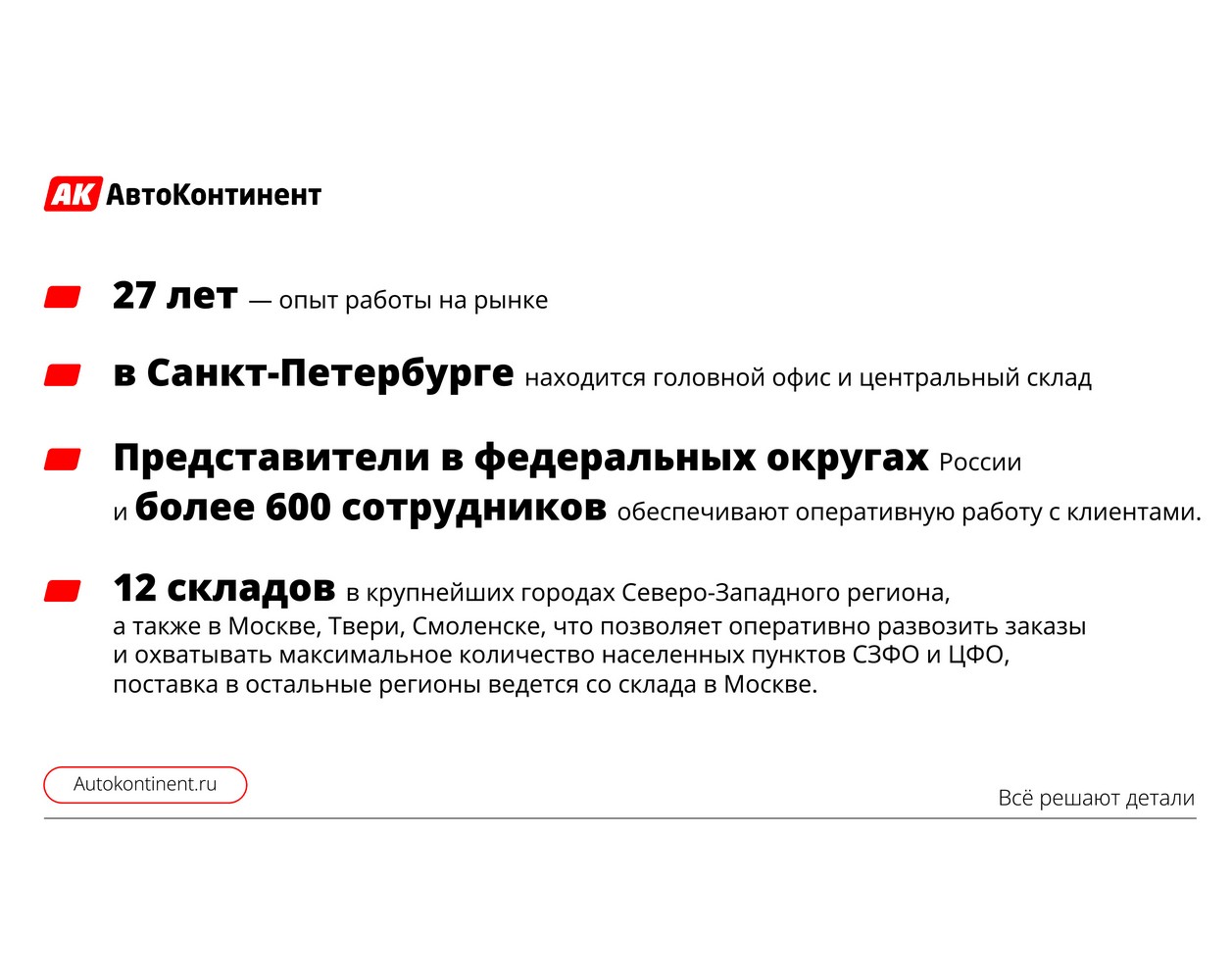 «АвтоКонтинент» — ведущий дистрибьютор автокомпонентов в России, принадлежит ООО «Форт». Работаем на рынке с 1998 года, центральный офис расположен в Санкт-Петербурге.